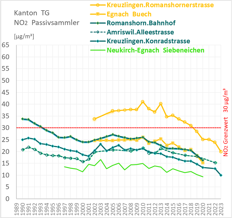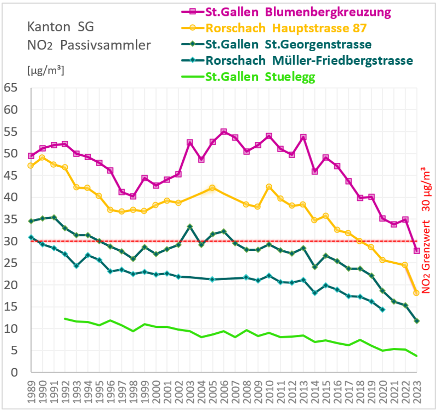 Langzeitmessreihen seit 1989 belegen einen kontinuierlichen Rückgang der NO2-Belastung nach 2016, was mit strengeren Abgasnormen und allenfalls auch strukturellen Veränderungen im Verkehrssektor in Zusammenhang steht (Abb. 2).
